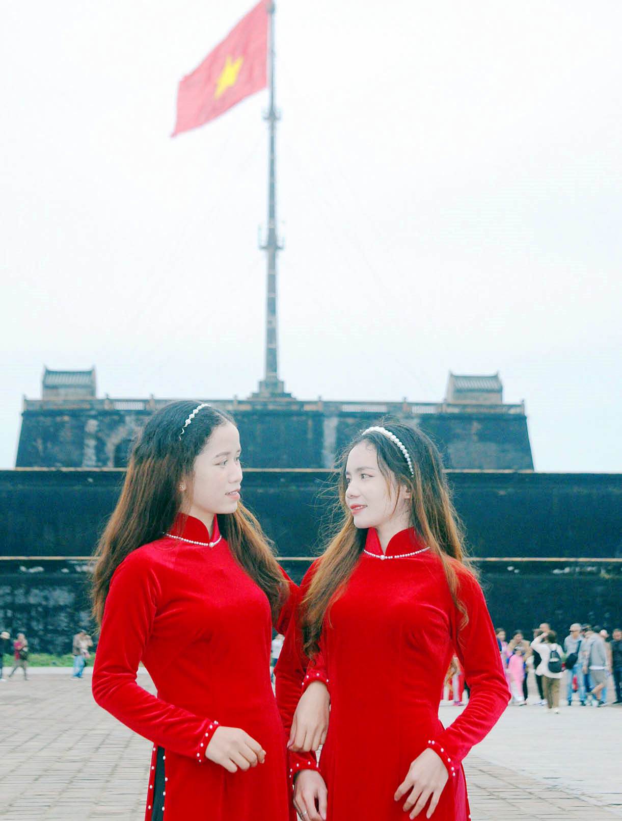 | Chanmany Seesavanh cùng cô bạn thân Keosy Xayakeo mặc áo dài chụp ảnh ở di sản Huế |