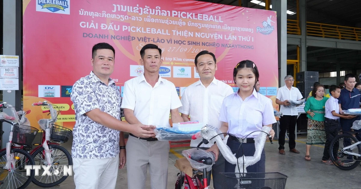 Doanh nghiệp Việt Nam tặng xe đạp và quà tặng học tập cho trẻ em khó khăn huyện Naxaithong, góp phần...